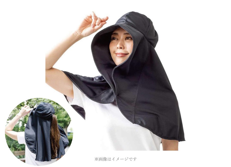 ケープと帽子が一体化し、顔まわりから首筋、背中までカバーできるフレアハット。