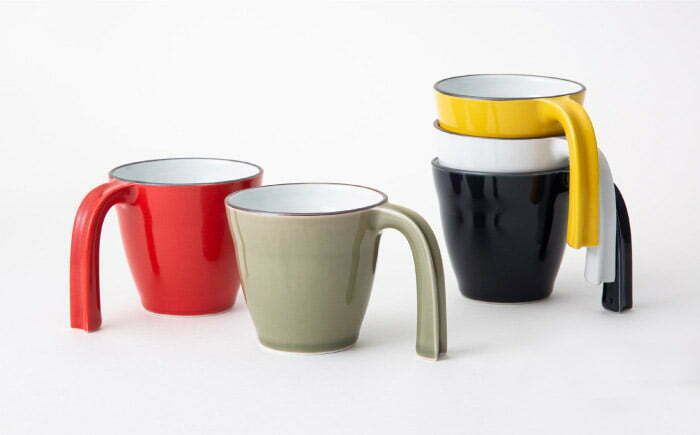 ユニバーサルデザインでハンドルが長く、マグの底と同様テーブルに接し、ハンドル部分と2箇所で支えるように工夫されています。