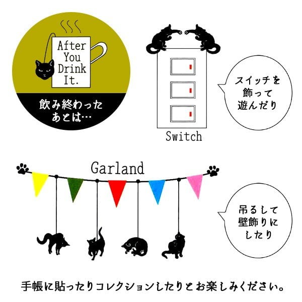 6つのポーズのねこがタグになっており、ねこちゃんが遊んだり、座ったり、のびをしたりと、かわいい姿に癒されること間違いなし♪